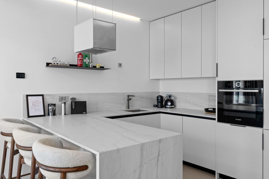 Voll ausgestattete Küche mit komfortablem Essbereich