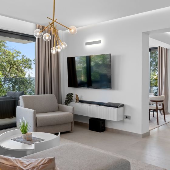 Im Wohnbereich und allen Schlafzimmern befinden sich modernste Flachbildfernseher & Audiosysteme